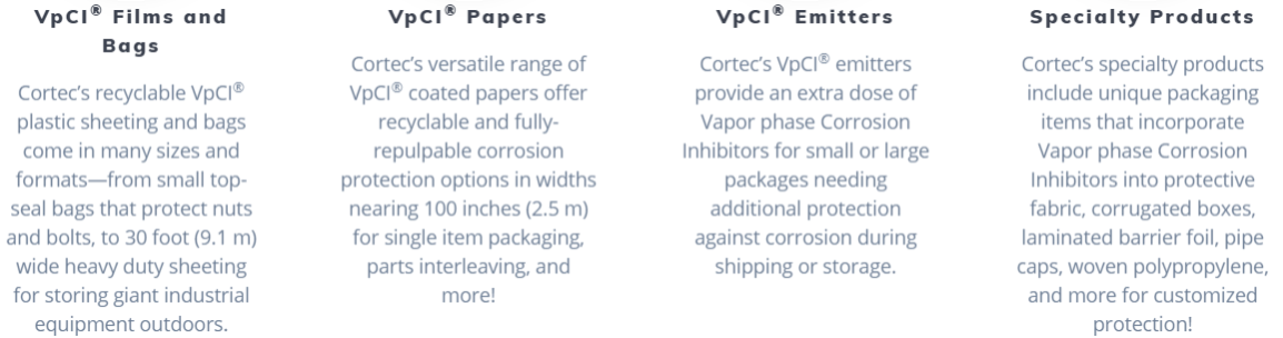 Cortec® offers a full range of VpCI® Packaging Solutions Solutions range from coated papers, impregnated foams, extruded films, cushions, emitter devices, inserts, and custom designed solutions; ensuring ease of integration, simplicity of use, and uncompromised performance